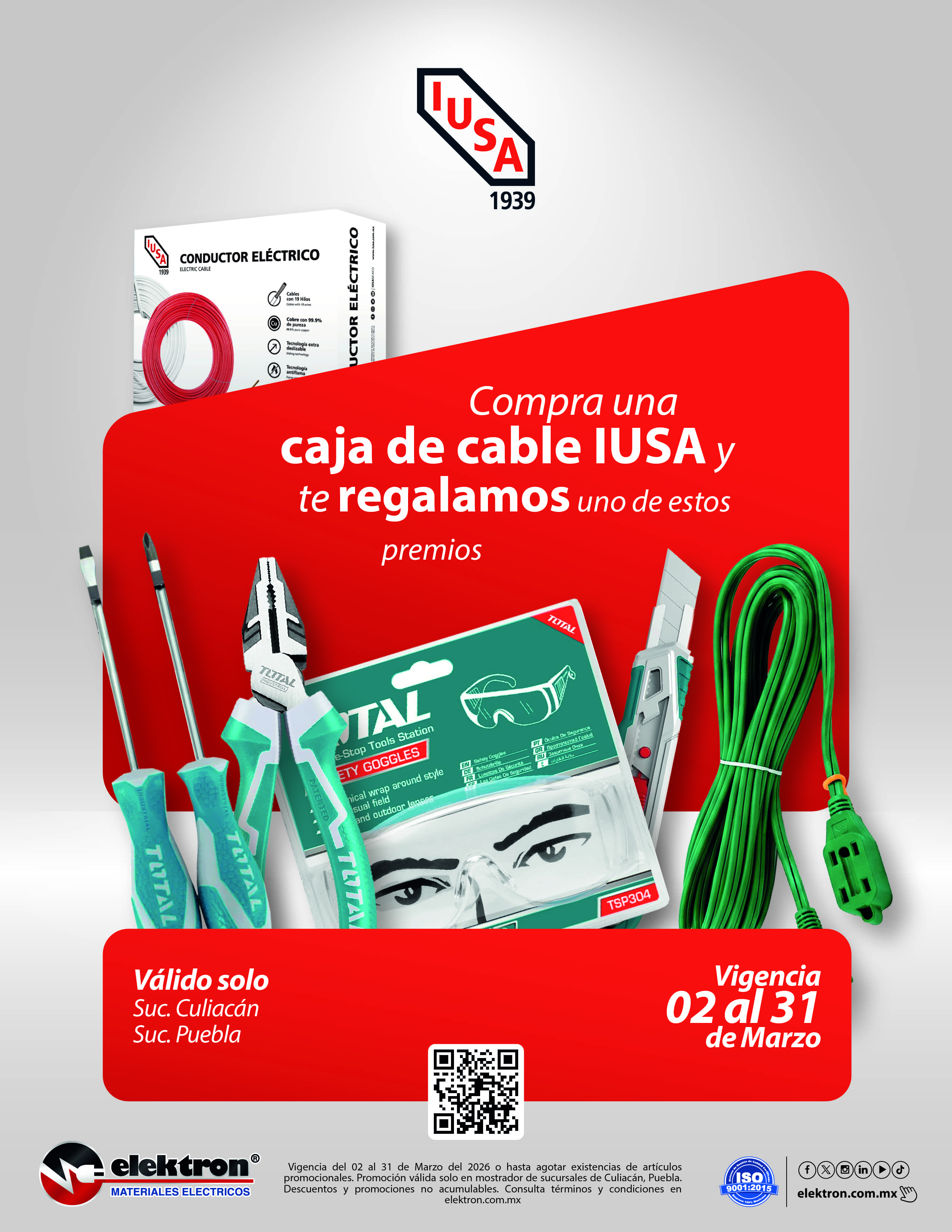 - Promoción válida del 2 al 20 de Marzo del 2026 hasta agotar existencias en sucursales seleccionadas de Elektron Materiales Eléctricos y tiendas satélites.