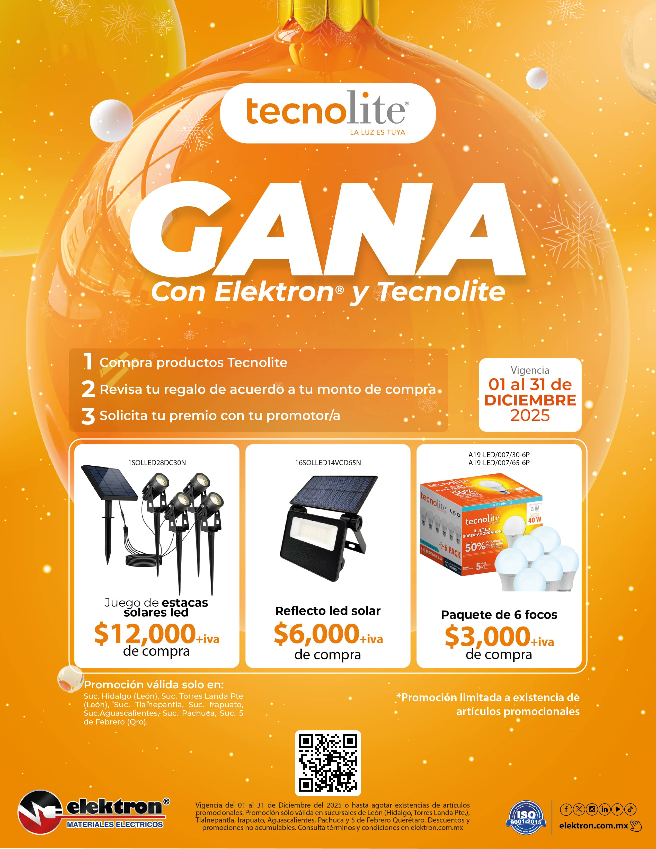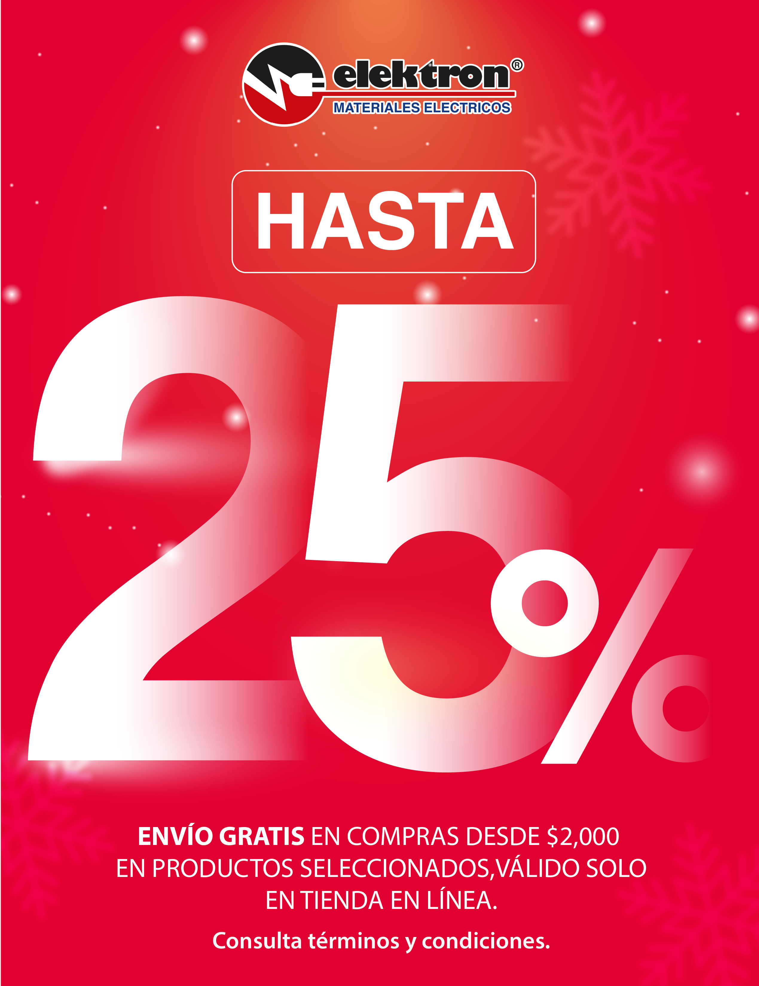 - Promoción válida del 1 al 31 de Diciembre del 2025 en sucursales seleccionadas de Elektron Materiales Eléctricos y tiendas satélites.