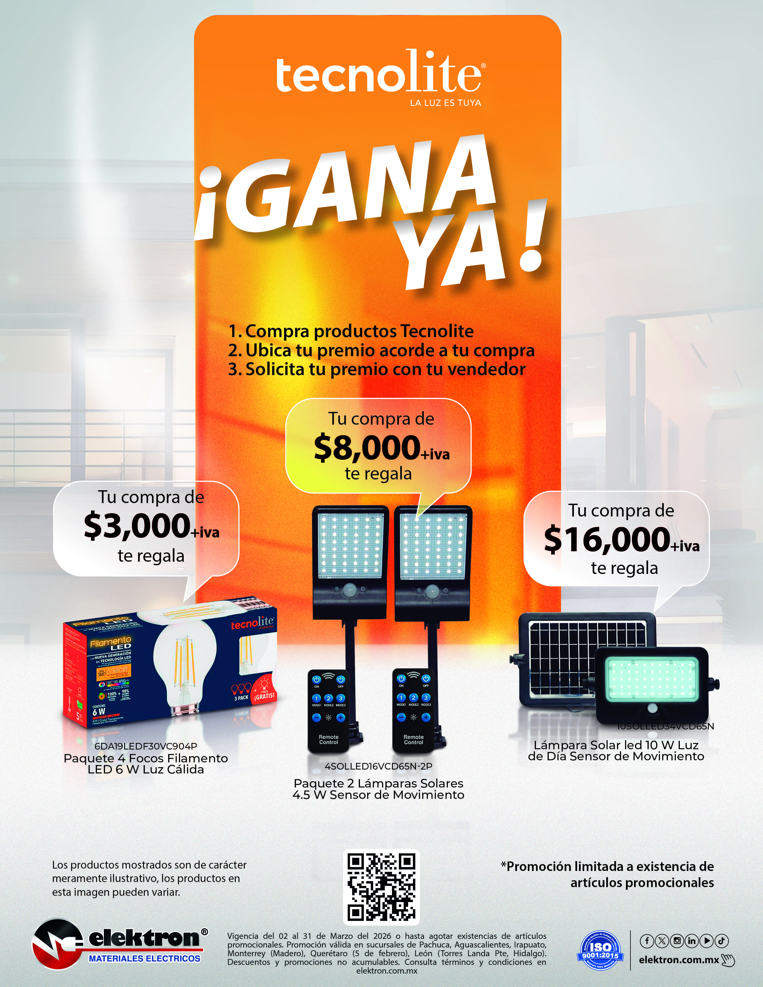 - Promoción válida del 2 al 31 de Marzo del 2026 hasta agotar existencias en sucursales seleccionadas de Elektron Materiales Eléctricos y tiendas satélites.